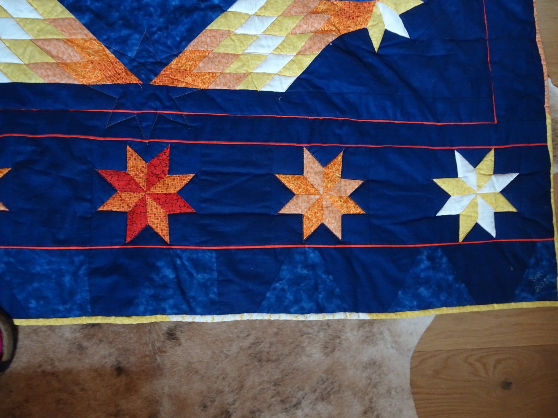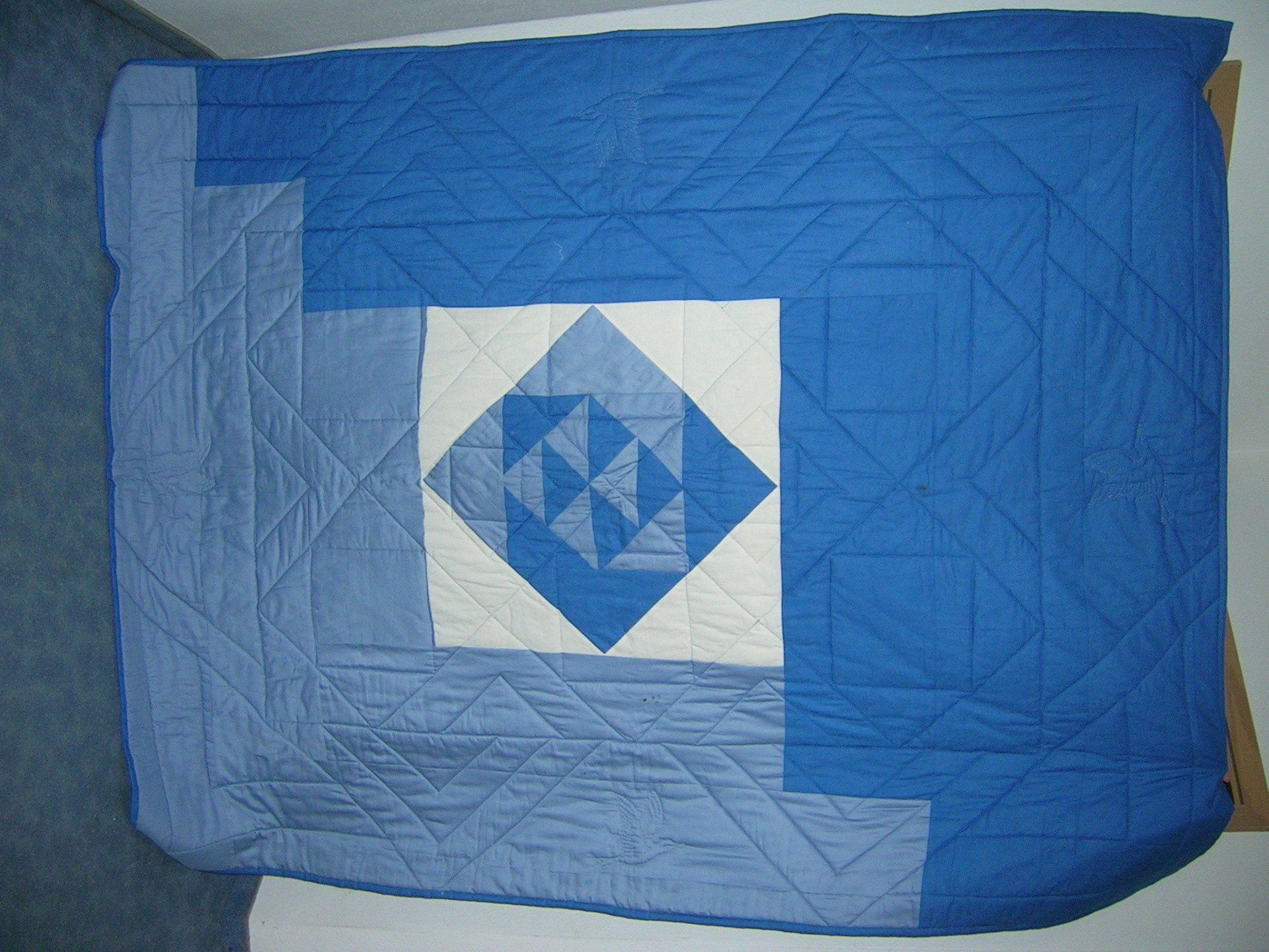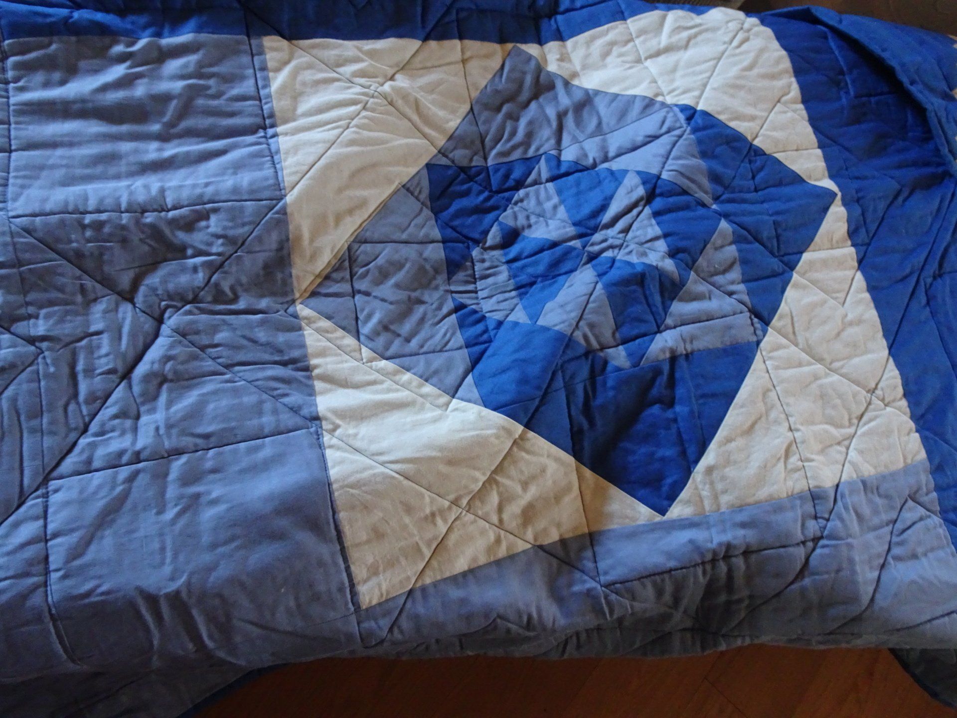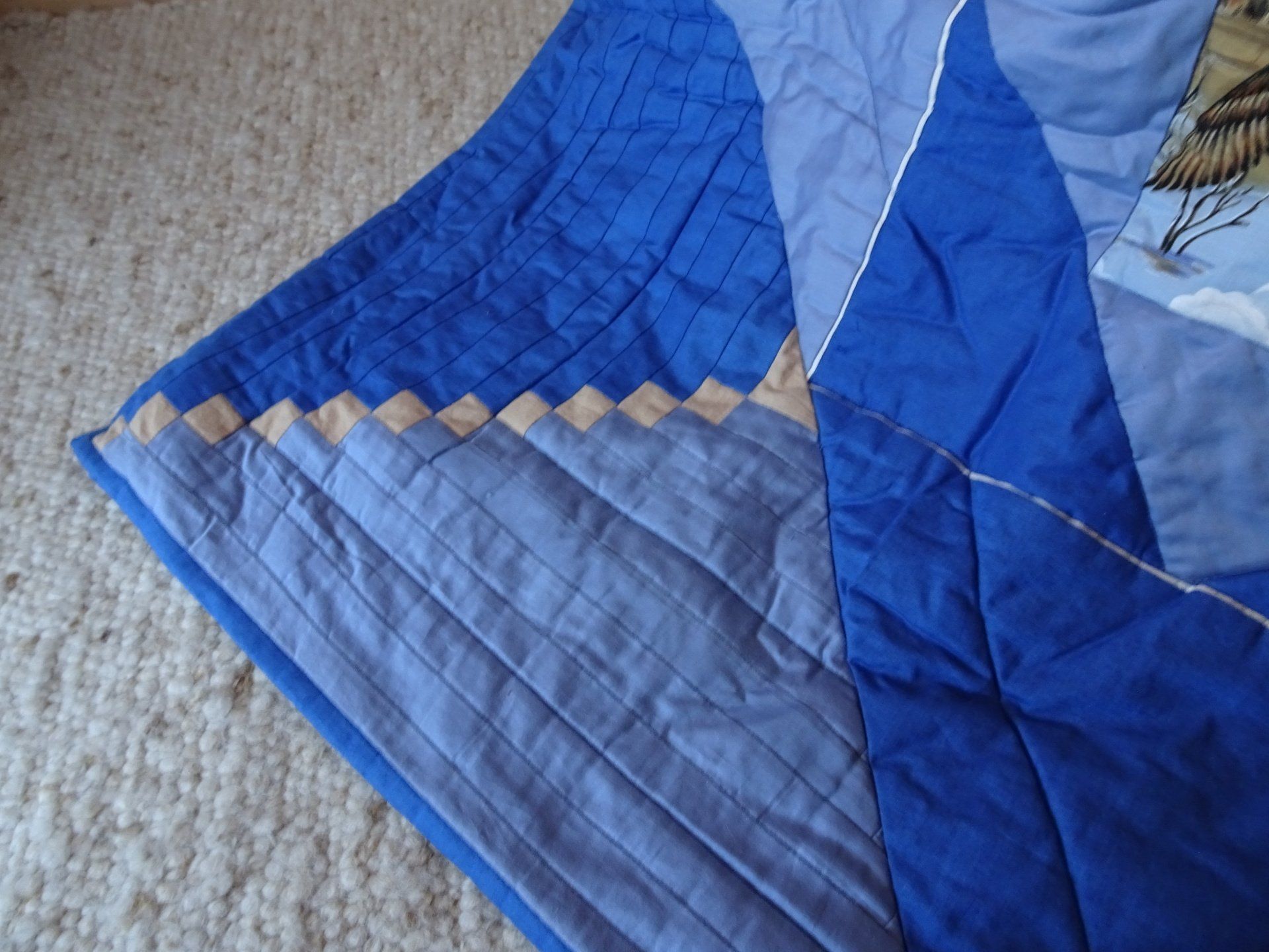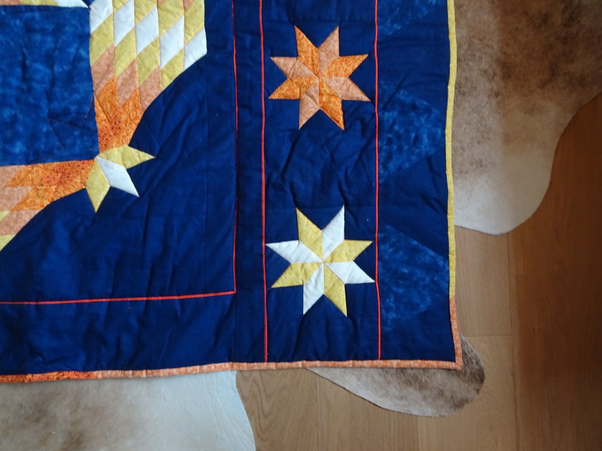 Meine Decken sind aus 100% Baumwollstoffen gefertigt. Die Füllung ist meist ein Vlies aus Polyester. Bei neueren Decken verwende ich inzwischen auch Vlies aus Baumwolle, Baumwoll-Woll-Mischung oder Bambus. Sie sind alle bei 30 Grad waschbar.